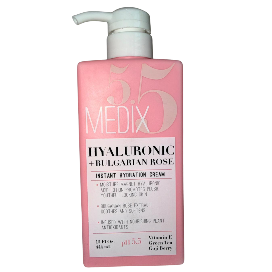 Medix 5.5 Hyaluronic + Bulgarian Rose est un soin corps ultra-hydratant formulé pour restaurer l’équilibre cutané, apaiser la peau sèche et améliorer l’élasticité naturelle. Enrichi en acide hyaluronique, reconnu pour retenir jusqu’à 1000x son poids en eau, et en rose bulgare, réputée pour ses propriétés apaisantes et régénérantes, ce lait corporel procure une hydratation intense tout en laissant un parfum délicat et féminin.